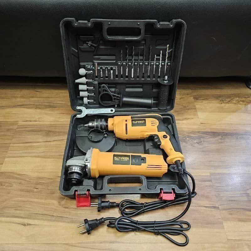 به همراه؛ کیف حمل، مته دیوار( سایز ۴، ۵ و ۶)، مته آهن (سایز ۴، ۵ و ۶)، مته چوب (۴، ۵ و ۶)، دسته دریل دریل، دسته فرز، آچار دریل و آچار